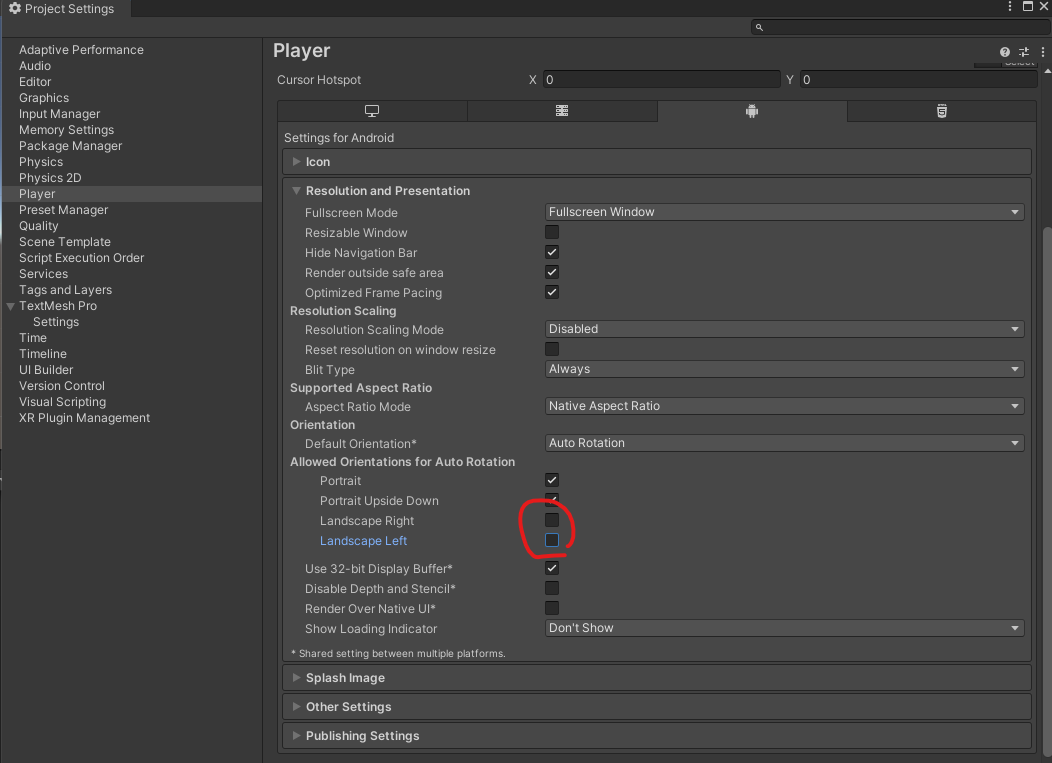 **Project Settings에서 Landscape Right, Left를 끄면 가로 화면이 되지 않는다.