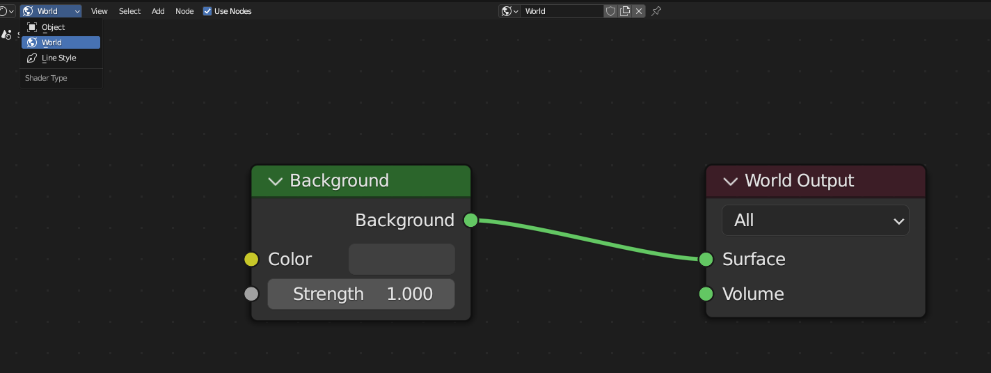 렌더 모드 배경 색을 바꾸기 위해서 [World]로 바꾼 후 색을 변경한다. (키보드 'Home' 키로 셰이더 가운데 보기 가능.)