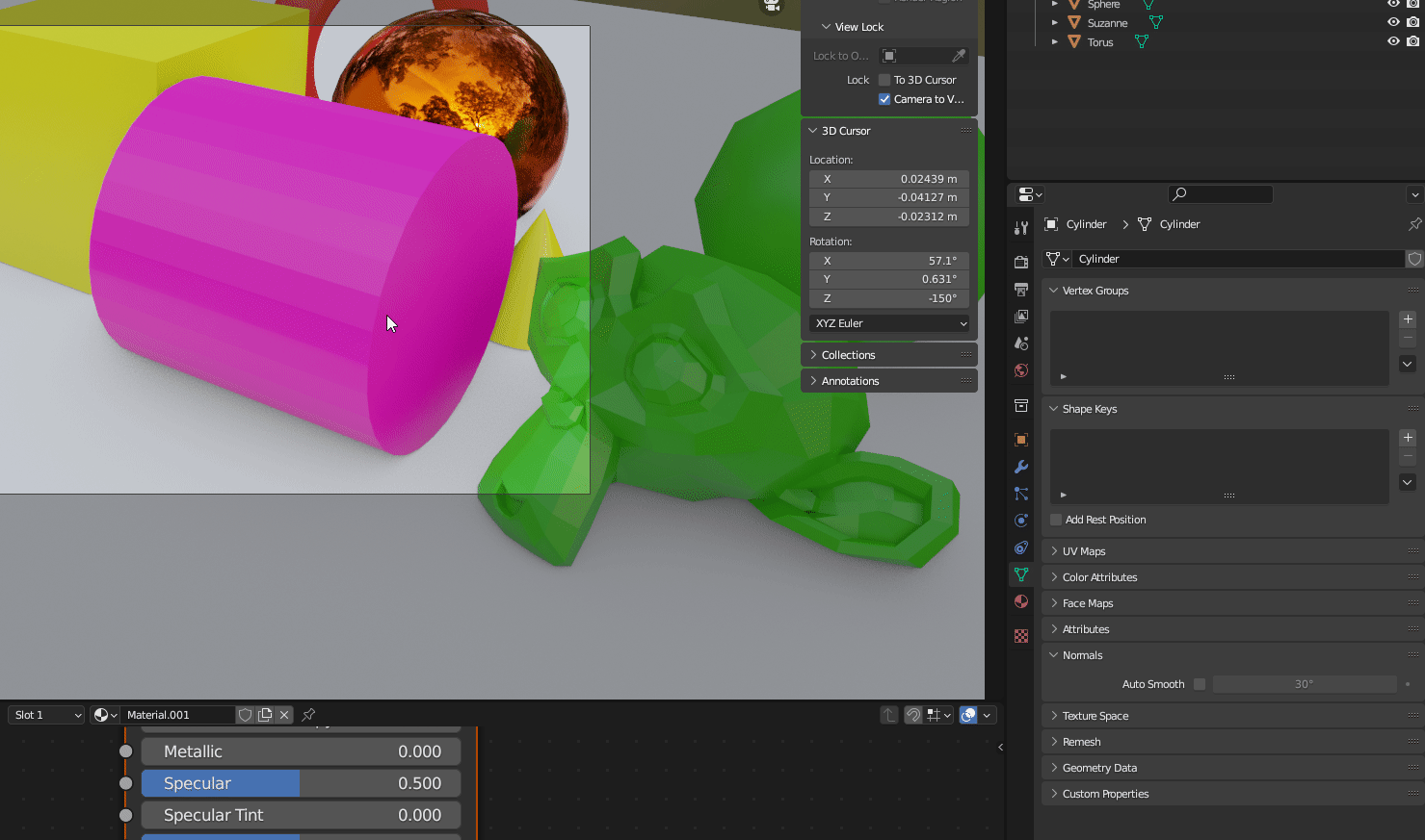 오브젝트의 [Metallic]과 [Roughness]를 조정 한 후 [마우스 오른쪽 클릭] - [Shade Smooth]로 표면을 매끄럽게 만들 수 있다.