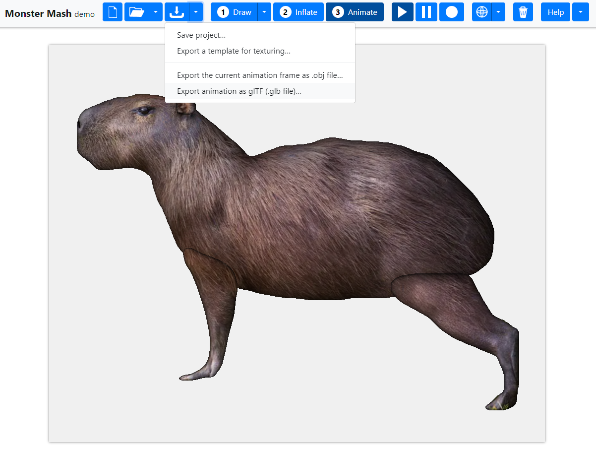 [Animate] 버튼을 누른 후 애니메이션은 넣지 않고 [Export animation as gITF]를 누르면 Blender에서 볼 수 있는 3D 오브젝트가 만들어진다.