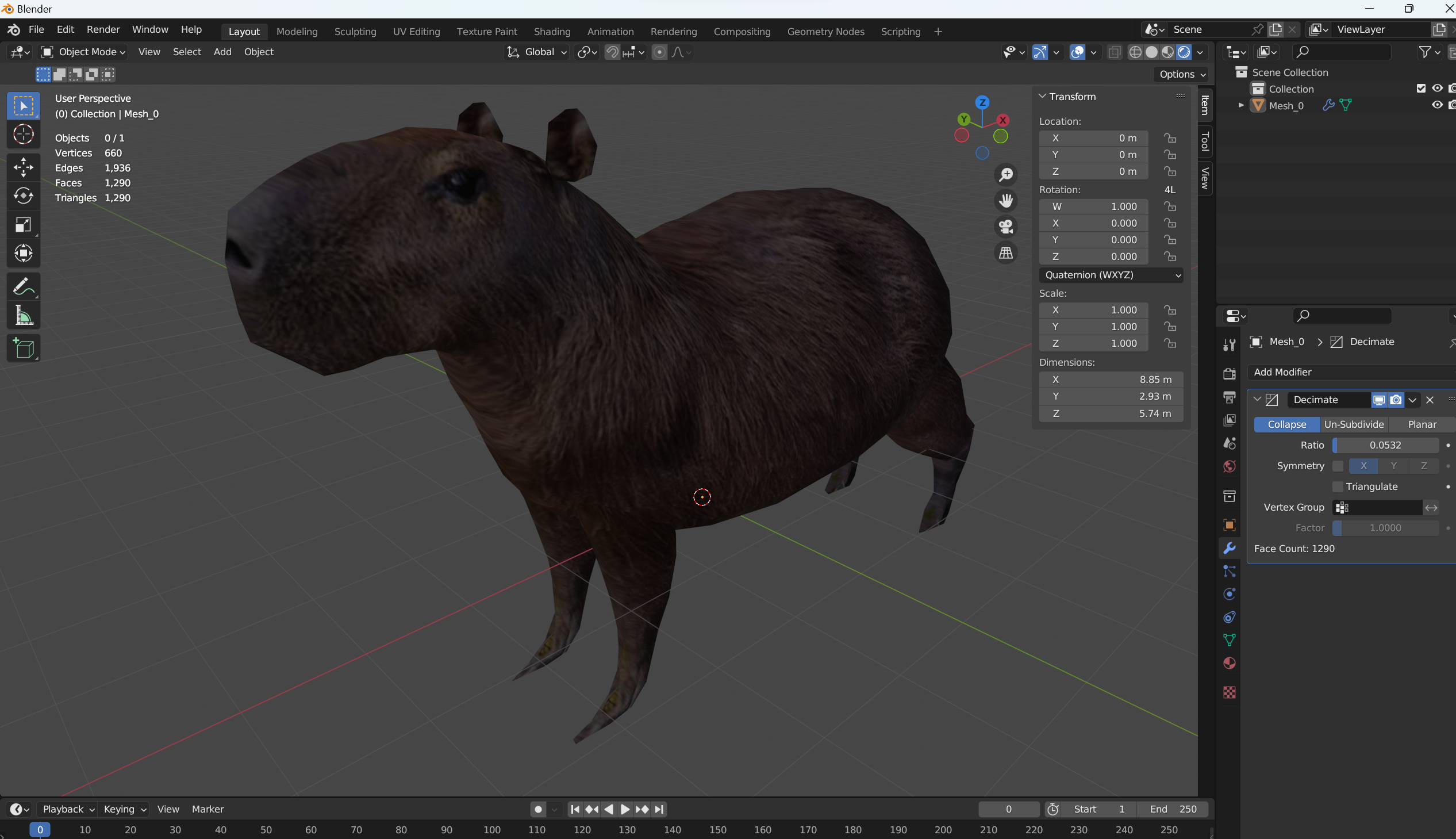 Triangles 수가 너무 높다면 [Decimate] 기능을 이용해서 줄이면 된다. 1,290 가까이 줄여도 크게 티가 나지는 않는다.