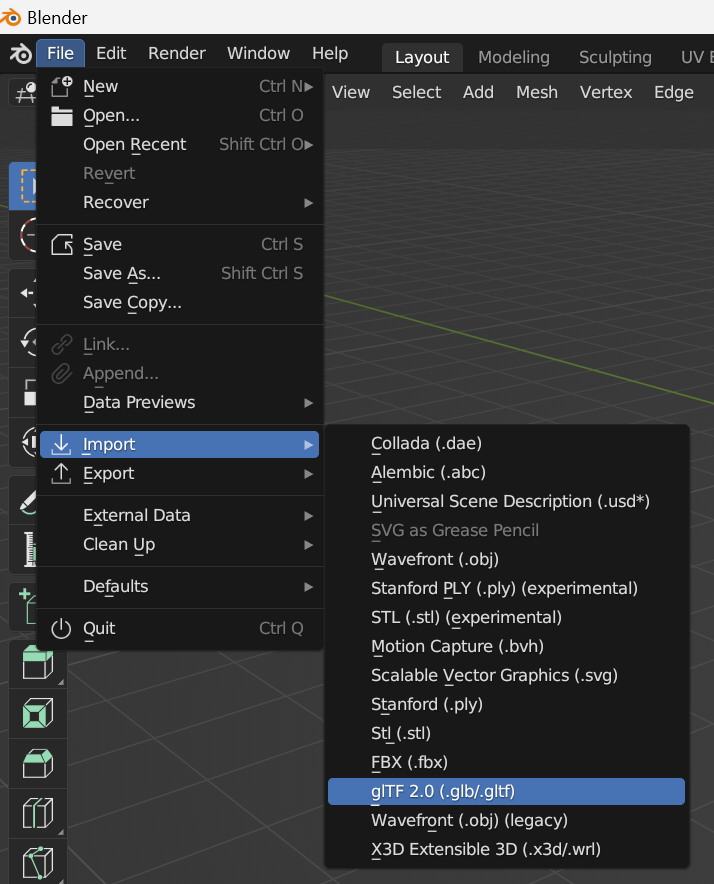 Blender에서, [File] - [Import] - [gITF 2.0]을 선택하면 웹에서 만들었던 개체를 블렌더에서도 볼 수 있다.