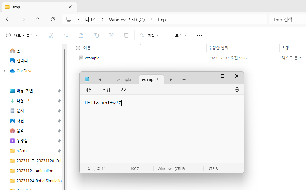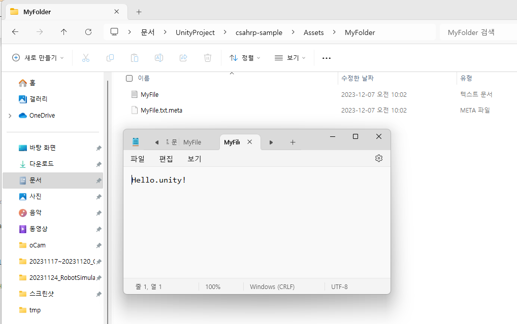 파일 경로에 txt 파일이 있어야 한다. 스크립트를 유니티 안에서 실행하면 파일에 "Hello.unity!"가 적혀있는 것을 볼 수 있다.