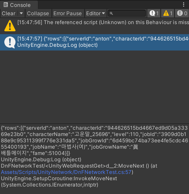 스크립트를 작성해서 GameObject에 넣고 실행하면 Console창에 표시가 된다.