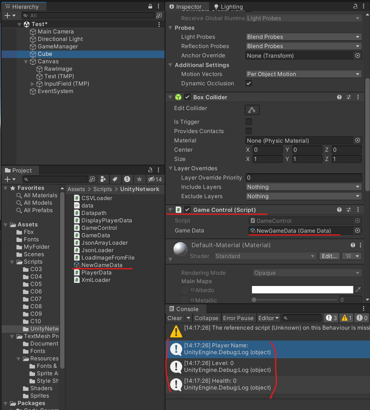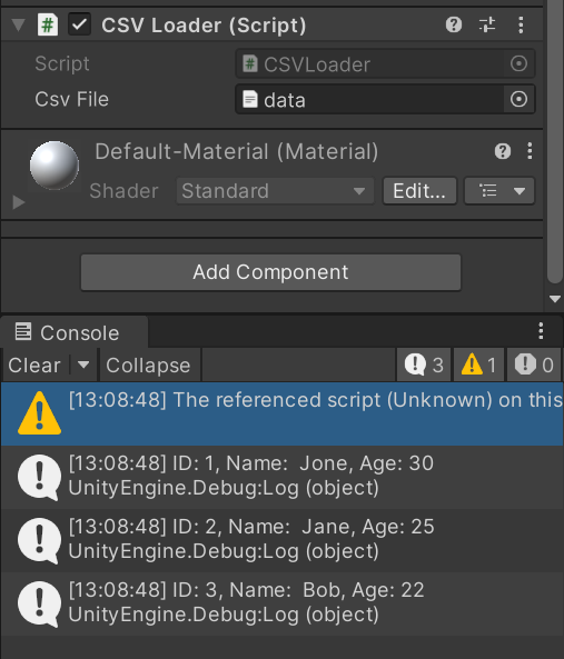 스크립트를 만들어서 GameObject에 넣으면, 결과 값이 출력된다. Person 클래스를 따로 C# 스크립로 만들어도 작동한다.
