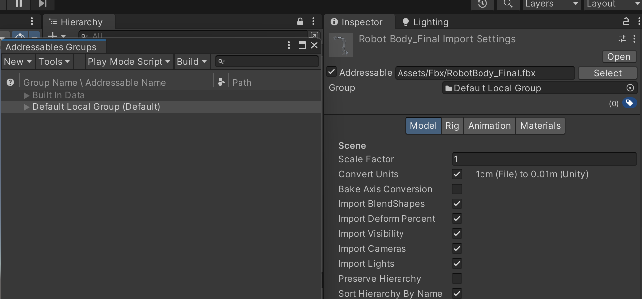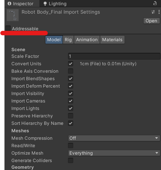 Addressables를 다운로드하여 Inspector 창에서 해당 기능을 체크할 수 있게 되었다.