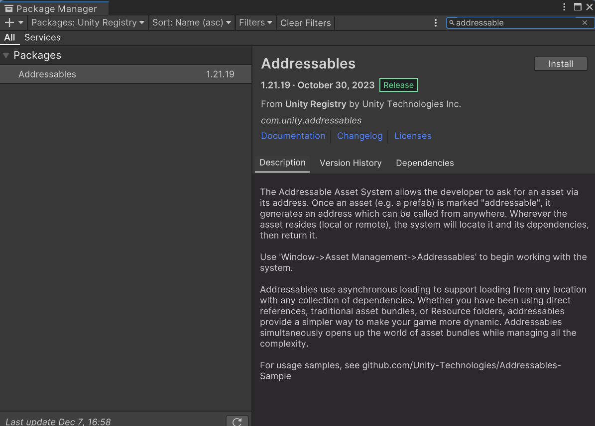 [Package Manager]에서 Addressables를 다운 받으면 Addressable Asset 시스템의 주요 이점을 사용할 수 있다.
