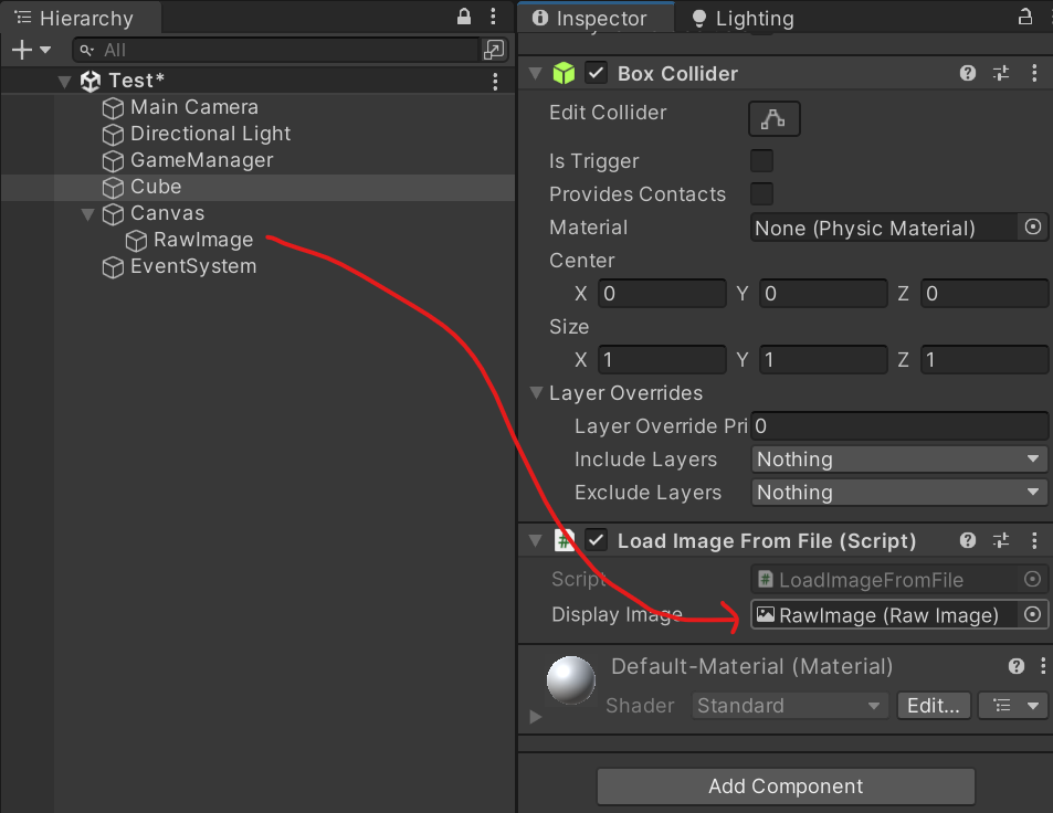위 스크립트를 GameObject에 넣고 해당 GameObject의 컴포넌트 중 비어있는 Display Image란에 [UI] - [RawImage]를 만들어서 끌어다 놓으면 유니티를 실행하면 이미지가 경로에 있는 이미지로 바뀌게 된다.
