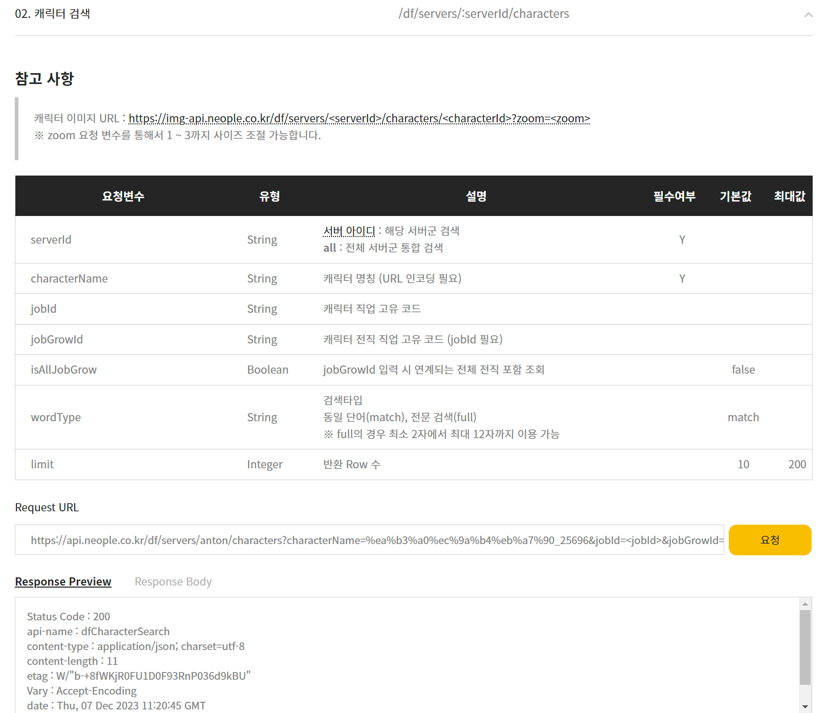 던전앤파이터 API 중 캐릭터 검색을 이용하기 위해서 코드를 수정해보았다.
