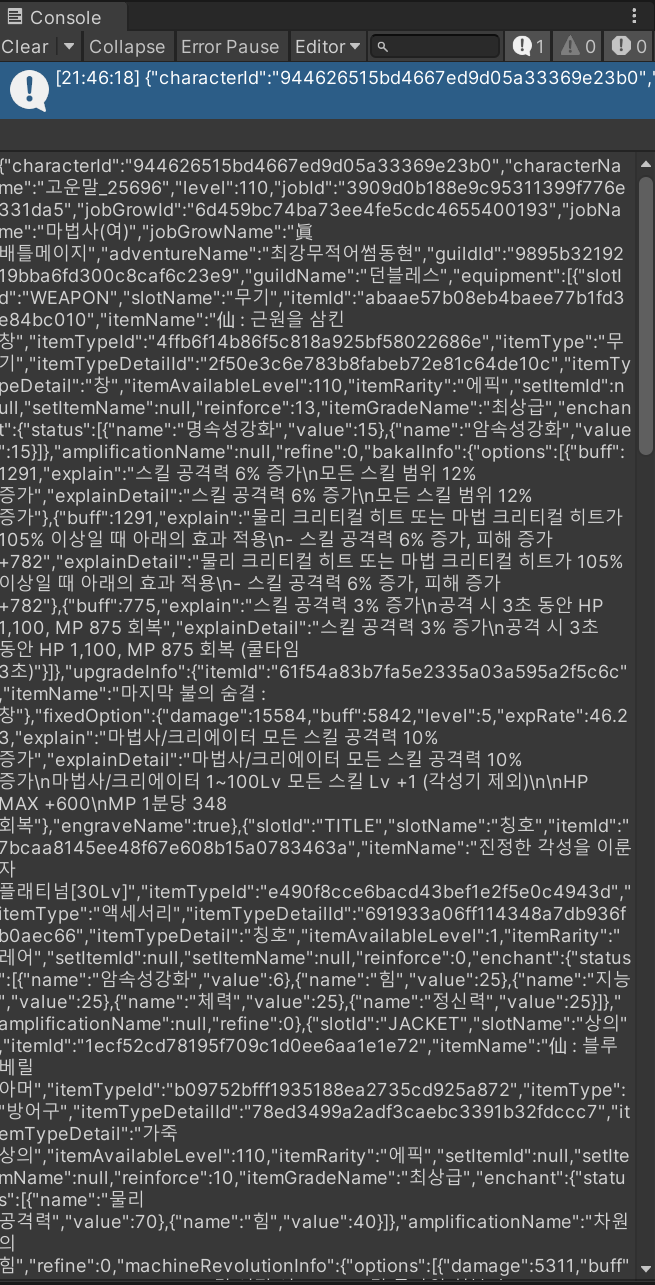 Debug.Log에서 나온 결과물은 엄청난 문자열의 향연이었다. 이전 캐릭터 정보와의 다른 점은 "rows"의 이름으로 출력이 시작되지 않는다는 점. row가 필요 없어보인다.