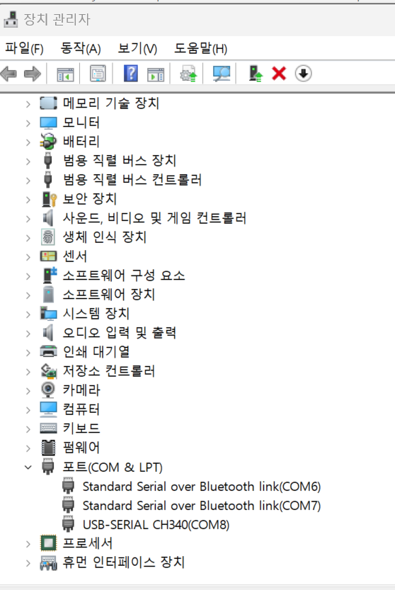 왼쪽 위 체크표시는 컴파일 버튼, 화살표는 아두이노에 업로드 버튼, 그 옆 드롭다운 박스는 시리얼 포트를 선택하는 부분이다. 이후 컴퓨터와 아두이노를 연결하면 장치관리자에서 통신 포트를 확인할 수 있다.
