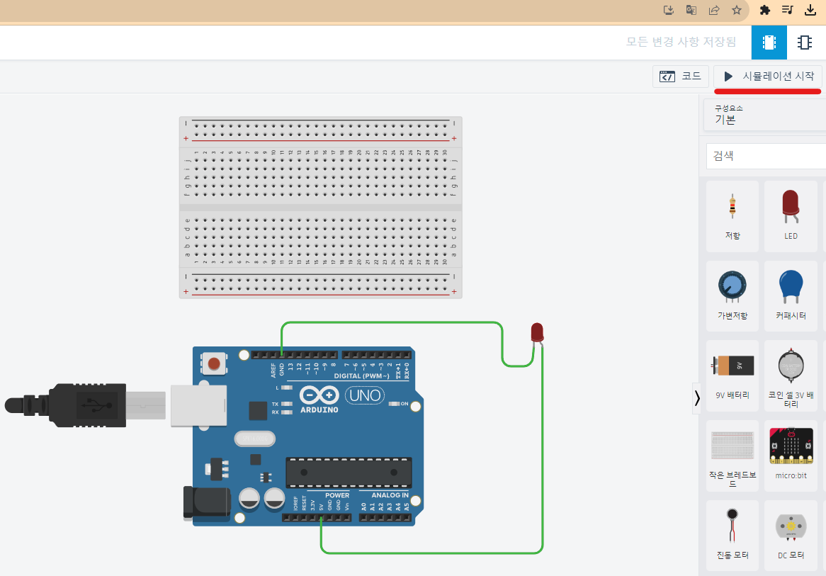 LED 켜기 예시. 마우스로 전선을 만들 수 있고 오른쪽 위에 시뮬레이션 시작을 누르면 시뮬레이션이 된다.