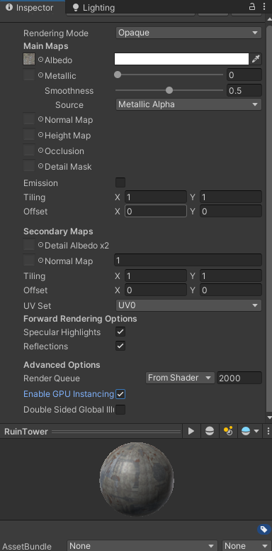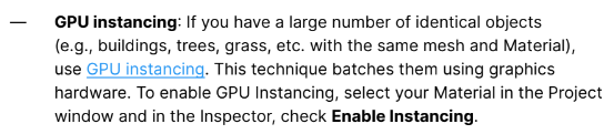 재질 Inspector 창에 모든 메테리얼의 [Enable GPU Instancing]을 체크 한다.