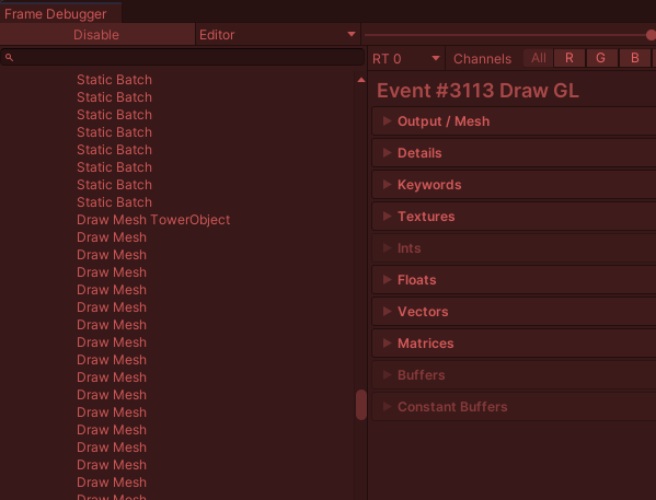 드로우 콜을 줄이기 위해서 세부 항목을 열어보면, [Render.OpaqueGeometry] - [RenderDeferred.GBuffer]에서 Static Batch, Draw Mesh 수가 엄청 많은 것을 볼 수 있다.
