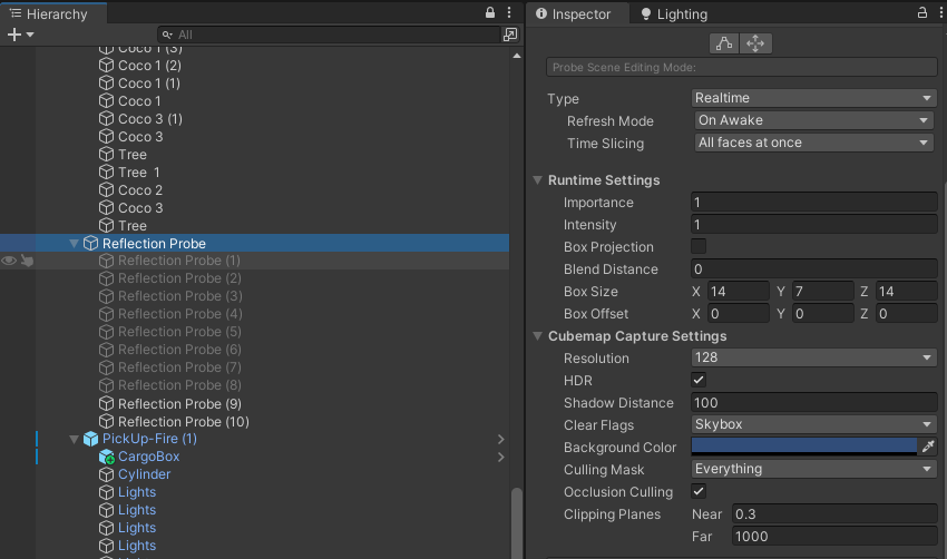 중간에 Reflection Probe가 Realtime으로 설정 되어있어서 필요없는 건물 내부의 것들은 비활성화 시켰다.