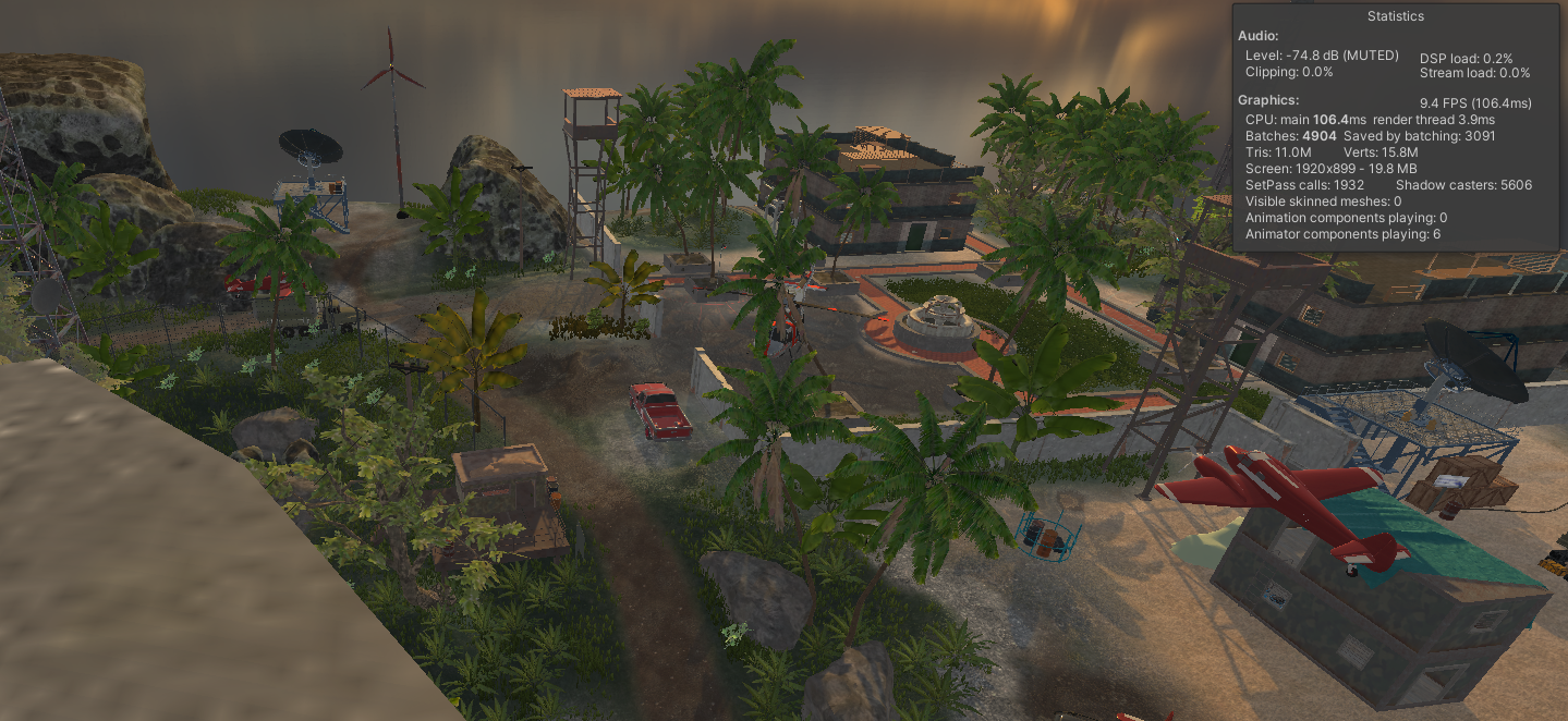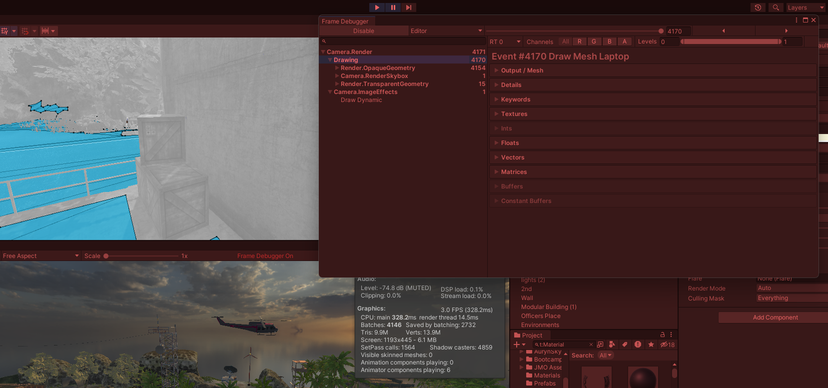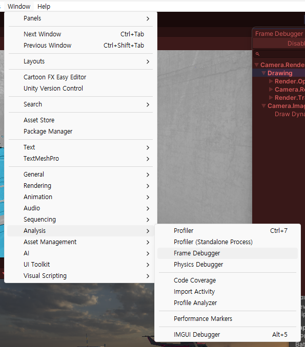 [Window] - [Analysis] - [Frame Debugger]를 열어서 가장 많은 에셋들이 보일 때 Enable을 눌러보면, 현재 씬에서는 9.9백만 개의 Triangle이 보여지고 있고, 4146개의 Batches 수를 볼 수 있다. 이 상태에서의 DrawCall은 4171이 뜨는 것을 볼 수 있다.