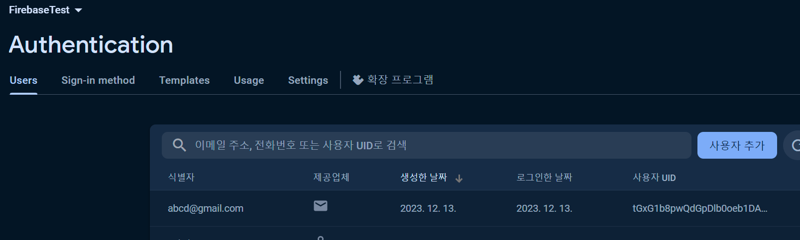 실행하고 아이디와 비밀번호를 Create하면, Firebase에 생성이 된다.