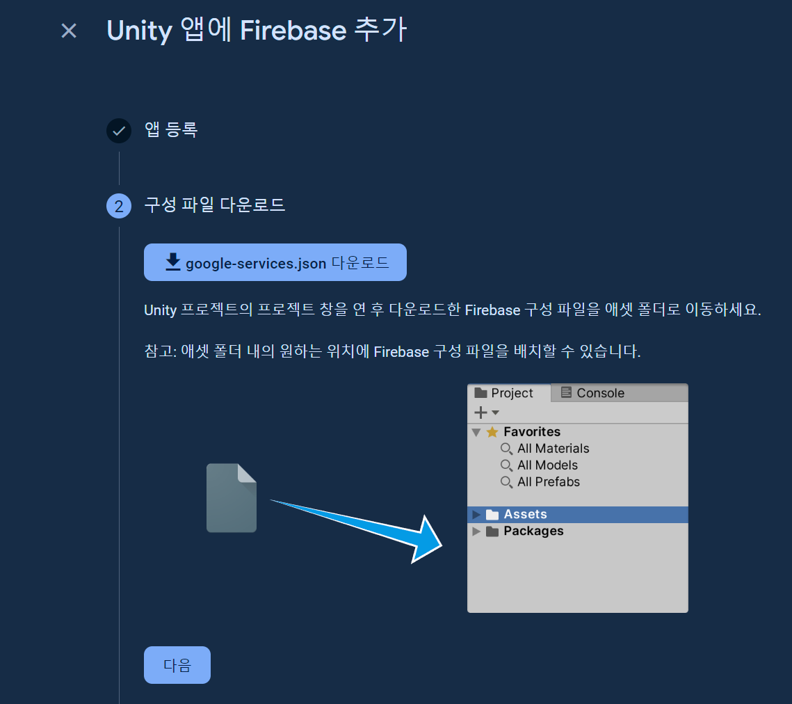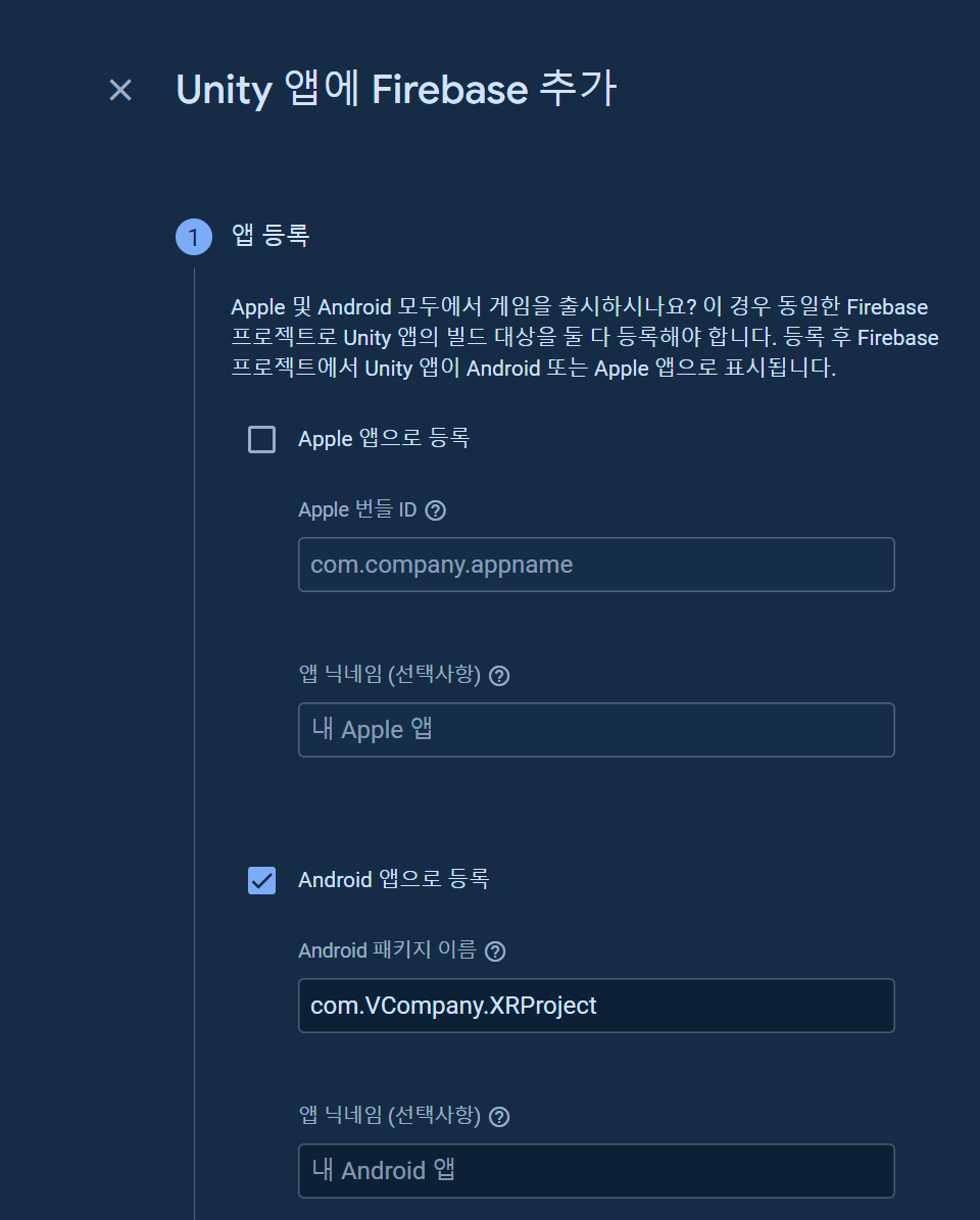 Firebase에서, Unity에서 설정했던 [Bundle Identifier] 이름으로 생성한다.