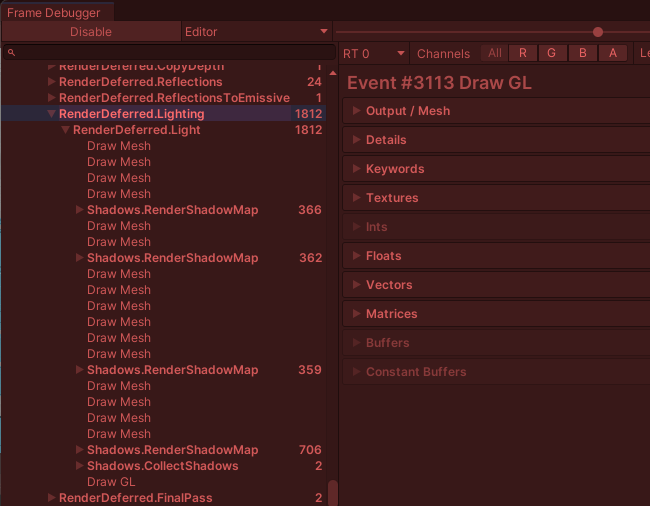 [RenderDeferred.Lighting] 항목도 많은 드로우콜 수를 가지고 있는 것을 볼 수 있다. Realtime 라이트를 쓰는 것도 드로우콜 증가에 큰 몫을 한 것 같다.