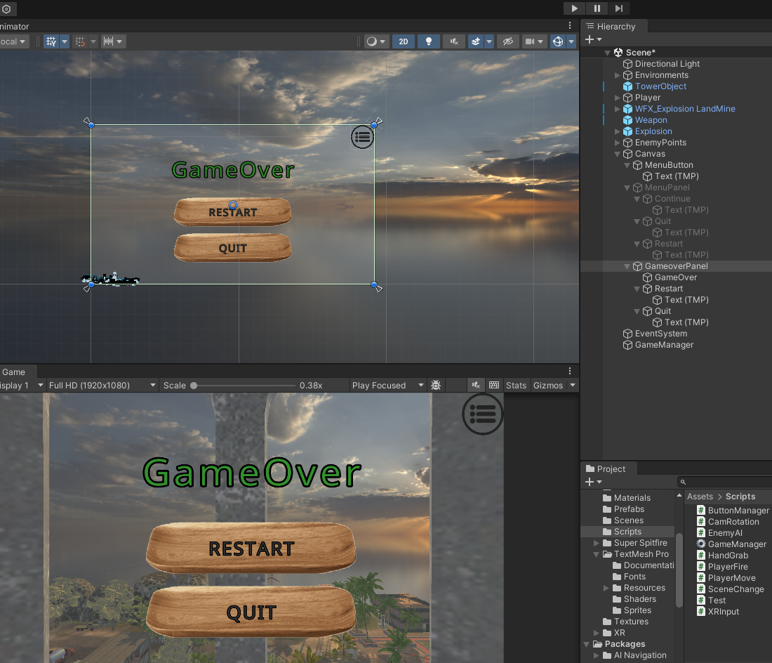 체력이 0 미만으로 떨어지면 GameOver 패널이 팝업 된다.