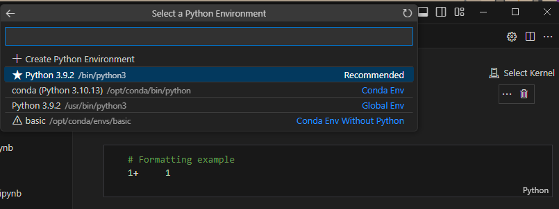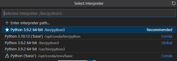 F1 누르고 Python Select Interpreter를 검색하면, Interpreter를 선택할 수 있다.(conda 경로에 있는 3.10.13 선택)