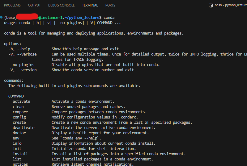 터미널에서 conda를 입력했을 때 쭉 뜨면 Anaconda가 설치되어 있는 것이다.