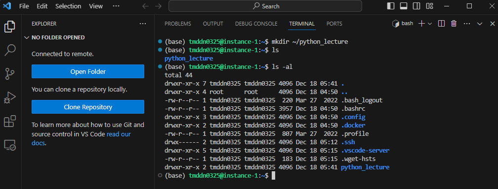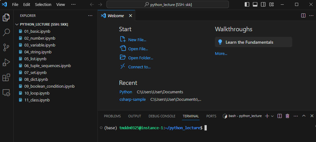 [Open Folder] 누르고 방금 위에서 만든 python_lecture를 검색하면 된다. 그리고 왼쪽에 교육 자료들을 넣으면 리스트로 보인다.