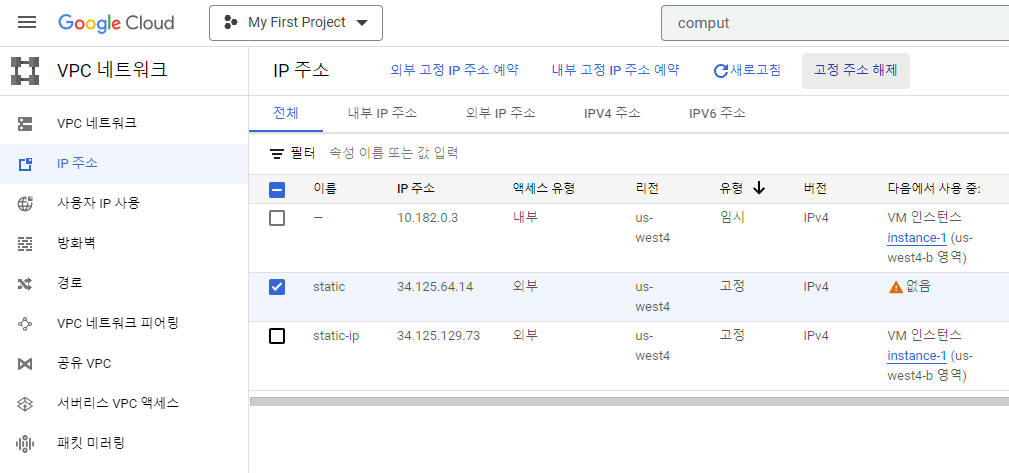 VPC 네트워크 - IP 주소 - 고정 주소 해제를 통해 해제해야 한 달 비용이 이제는 나가지 않는다.