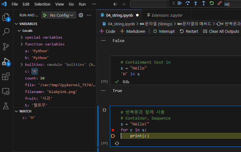 셀에서도 디버그가 가능하다. BreakPoint를 잡고 실행 버튼 옆에 작은 Debug Cell 누르면 한 줄씩 볼 수 있다. WATCH 부분에 우리가 보고 싶은 변수 c를 넣고 변하는 모습을 보면 된다.