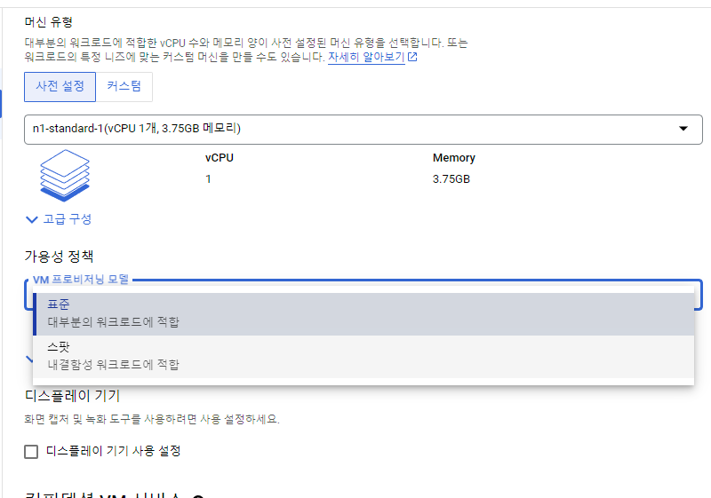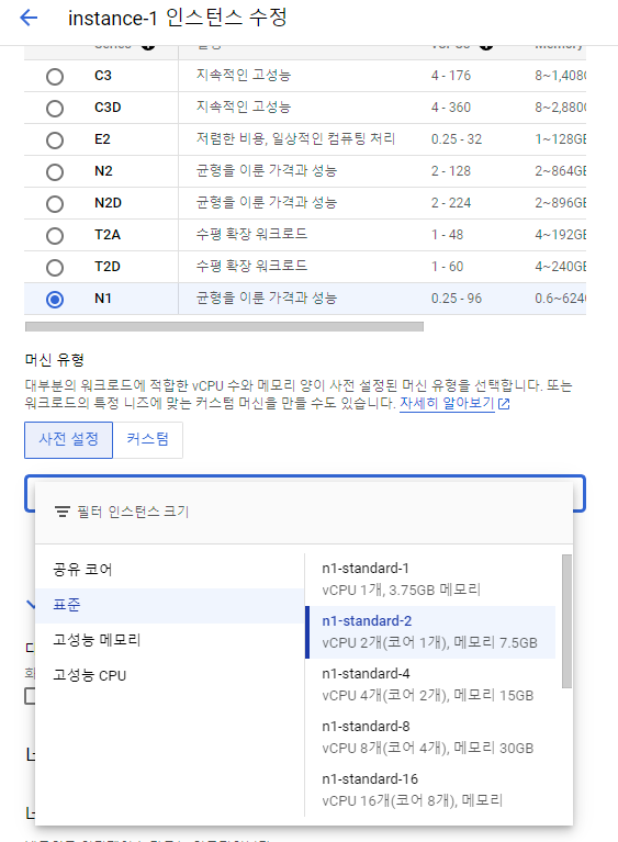 아니면 VM 인스턴스 중지 후 수정해서 한 단계 더 높은 메모리의 7.5GB 짜리를 선택한다.