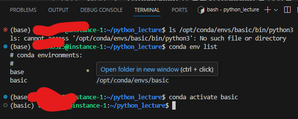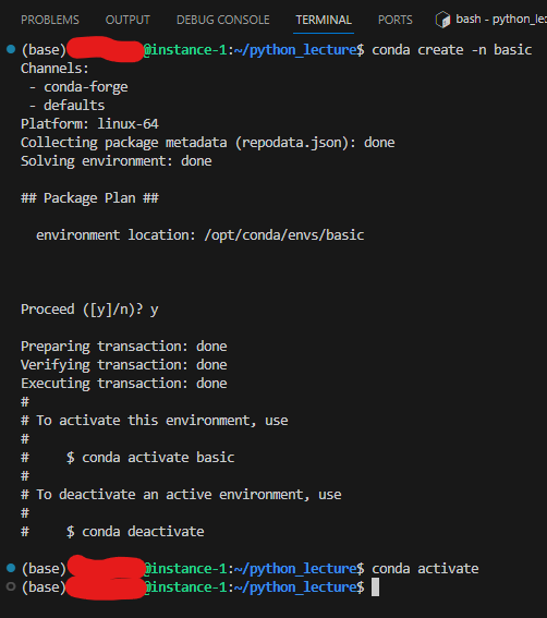"conda activate basic"으로 basic 안으로 들어갈 수 있다.