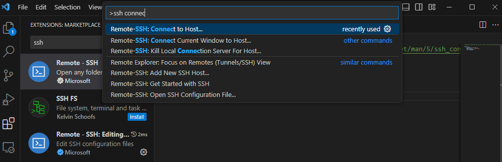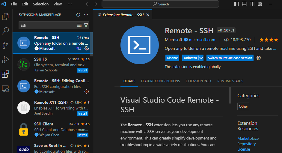 다시 VS Code로 돌아와서, Extensions 중 Remote - SSH를 설치한다.