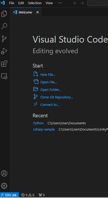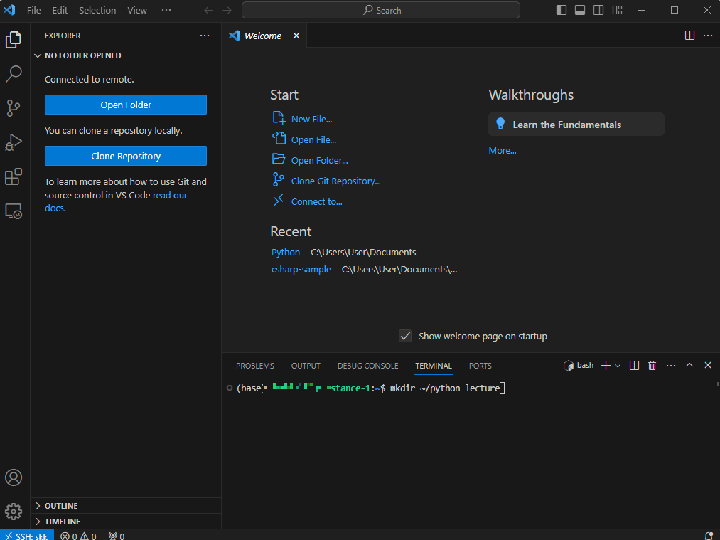다시 VS Code로 와서 ssh connect to host 한다. Linux 선택, 다 되면 왼쪽 아래에 SSH: skk에 연결이 되는 표시가 뜬다.