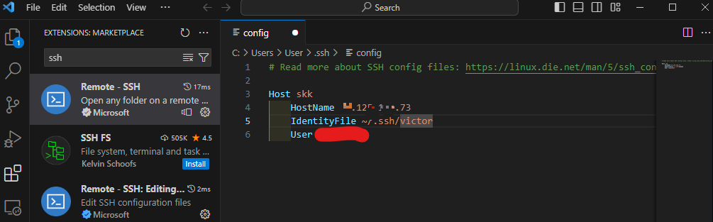 아래와 같이 config 파일을 생성한다. HostName은 VM 인스턴스에 뜬 외부 ip를 넣고 IdentifyFile은 ssh 키에 적용된 이름을 입력하고 User에는 ssh 키를 생성할 때 입력했던 구글 아이디를 넣는다.