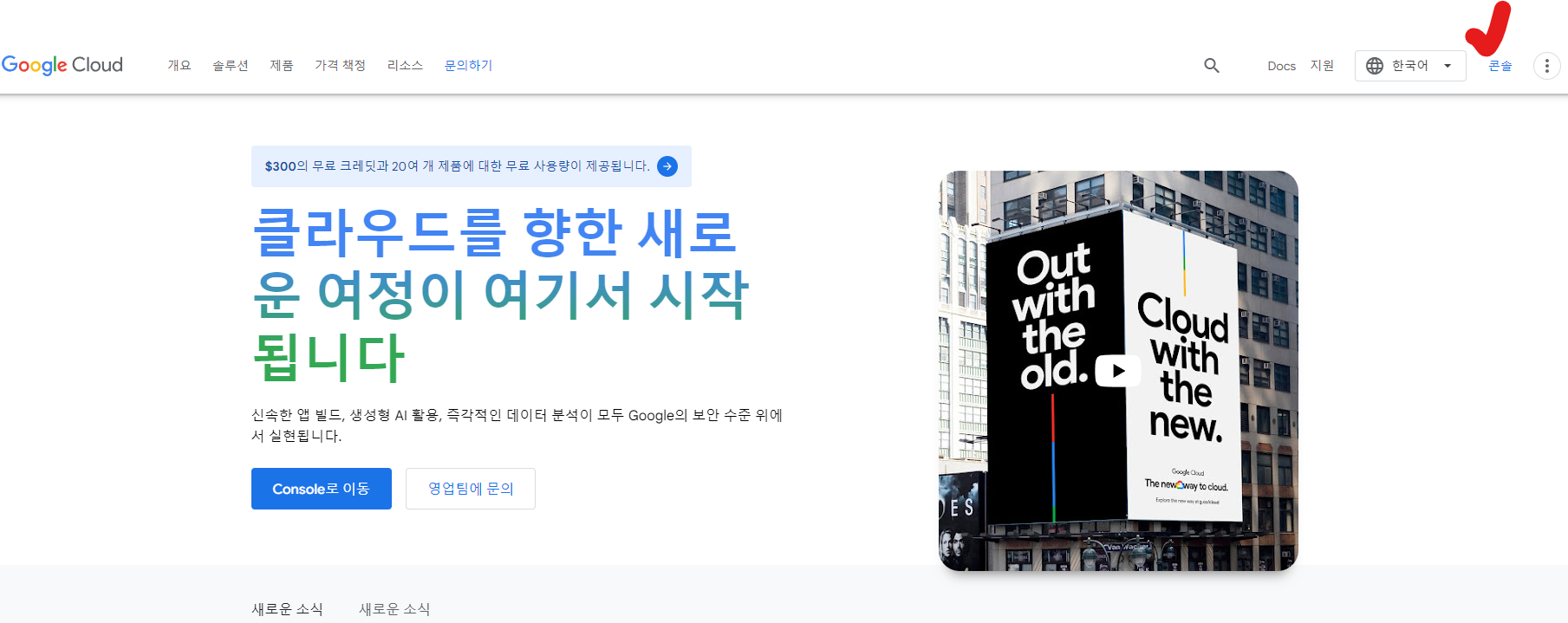 구글 클라우드 접속 - 우측 위 [콘솔] 클릭