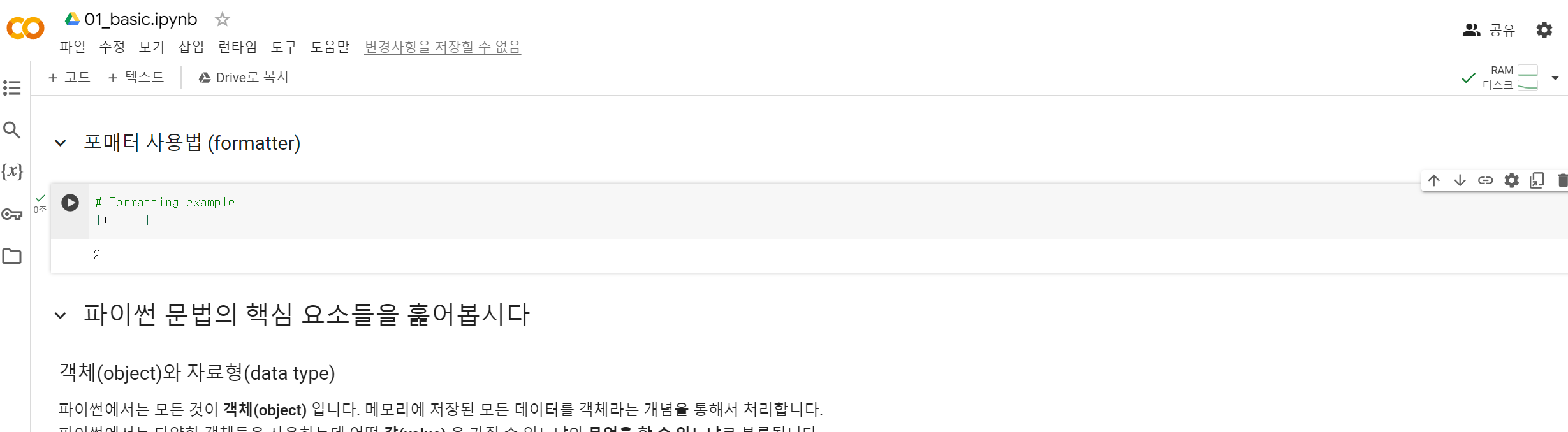 셀 클릭 후 esc, b누르면 아래에, a누르면 위에 셀 생성