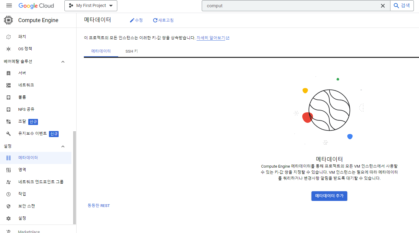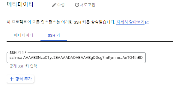 [메타데이터] - [SSH키] - [메타데이터 추가]