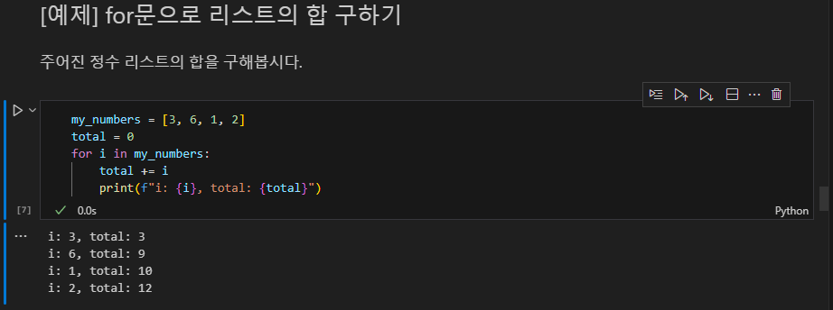 예제 -for 문으로 리스트 합 구하기