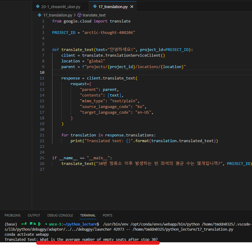 아까 키를 넣어서 받은 프로젝트 이름을 PROJECT_ID에 넣고 아래의 코드를 실행하면 번역이 된다.