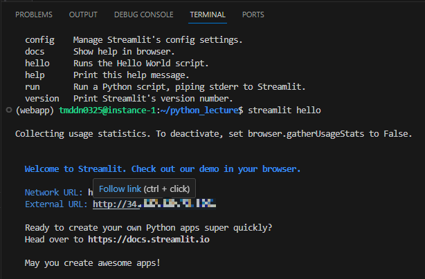 Terminal에 streamline hello를 입력하고 External URL에 마우스 올려놓고 Follow link를 누르면 포트를 통해서 페이지가 열린다.