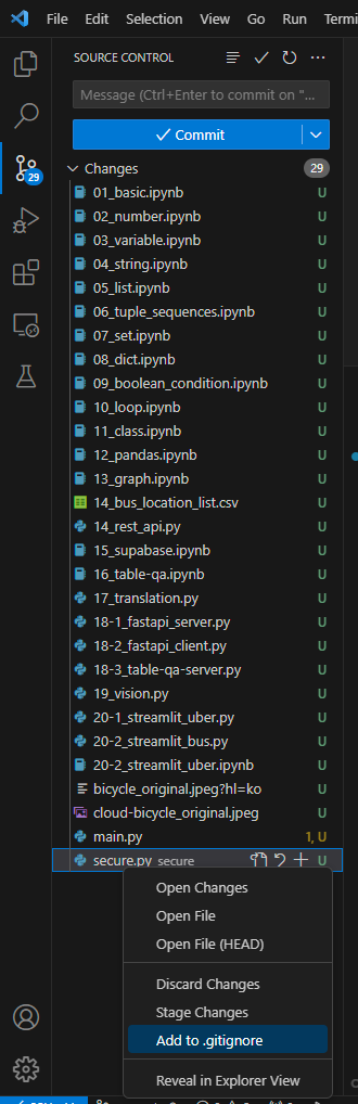 Source Control에서 만든 파이썬 파일을 마우스 오른쪽 클릭해서 Add to .gitignore 한다.