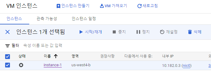 어제 끝날 때 중지했던 VM 인스턴스 시작/재개