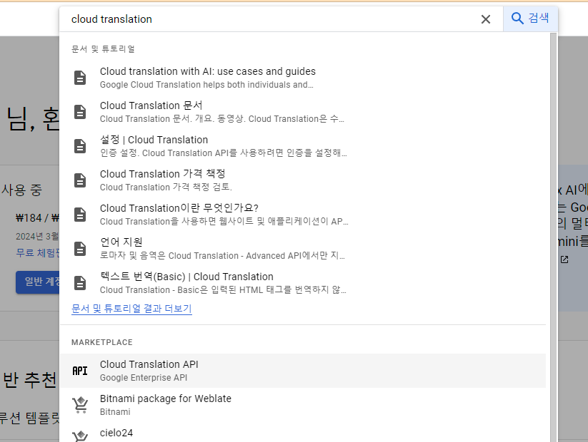 구글 Console에서 cloud translation 검색