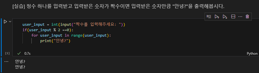 예제 -정수 하나를 입력받고 입력 받은 숫자가 짝수이면 입력 받은 숫자만큼 "안녕?" 출력