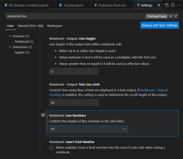 *Ctrl + , 하면 Settings 뜨고 Line Numbers를 켜면 라인 넘버를 볼 수 있다.