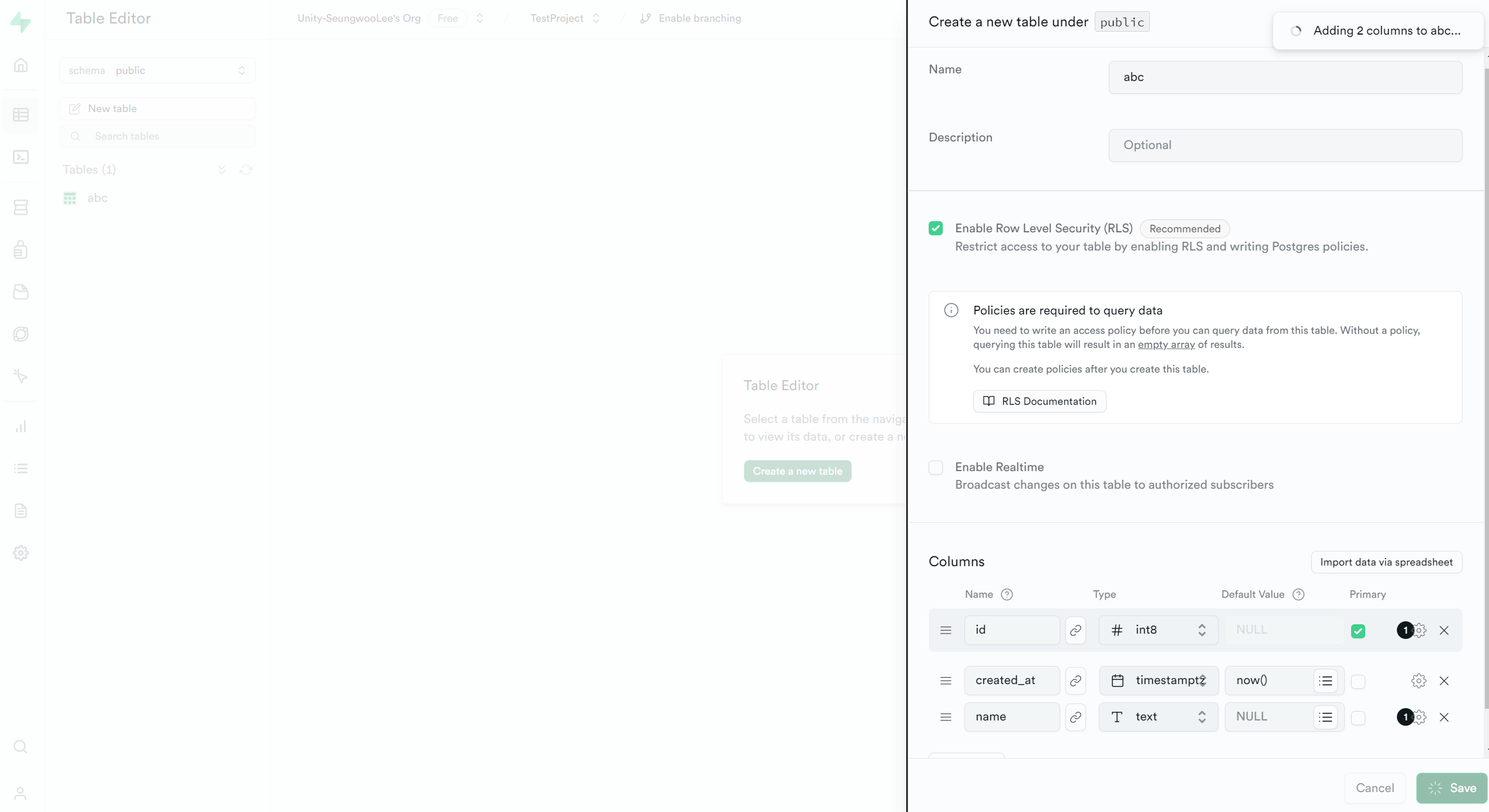 Supabase에서 Table 생성