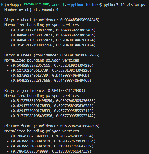 python3 19_vision.py를 입력하면 어떤 물체들을 인식했는지 볼 수 있다.
