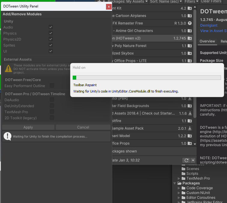 패널이 켜지고 꺼질 때의 효과를 주기 위해서 에셋스토어에서 DOTween을 받는다.