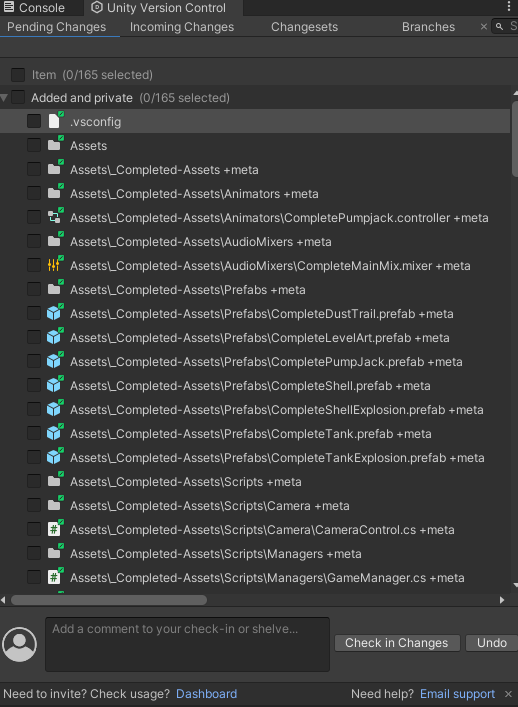[Window] - [Unity Version Control] 창을 켜고, 창에서 로그인, Create WorkSpace를 하면 다음과 같이 추가된 에셋들을 볼 수 있다.