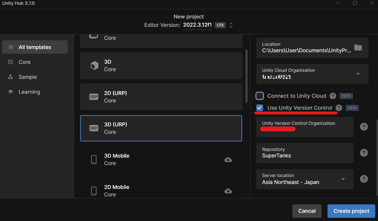 3D URP 프로젝트 생성, Use Unity Version Control을 체크하고 location은 Japan으로 설정한다.